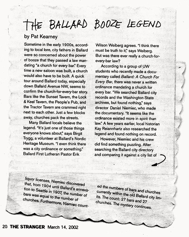 Ask someone in Ballard why there are so many churches and bars in such a small area, and they'll likely speak of a legend that's as old as the town itself. Some locals believe that the city fathers of Ballard actually created an ordinance to guarantee spiritual equality within the community, that required a church be built for every bar that was issued a license.