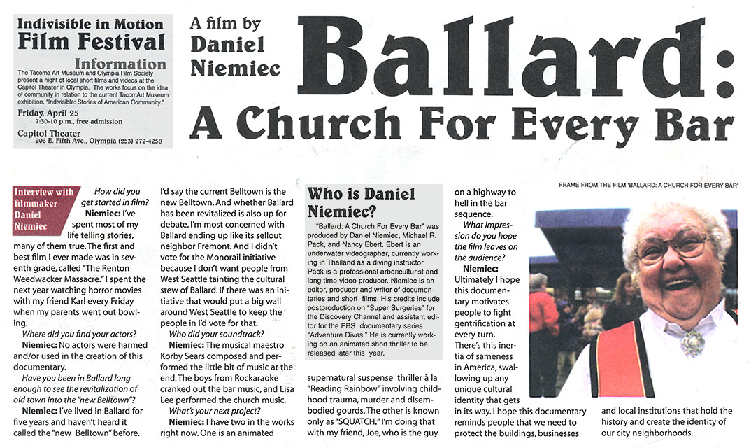 BALLARD: A CHURCH FOR EVERY BAR is a short documentary exploring Ballard's history, folklore, vice and virtue through the colorful people that live here today. Did such an ordinance exist? Is the legend true? Find out whether there really is- a church for every bar.